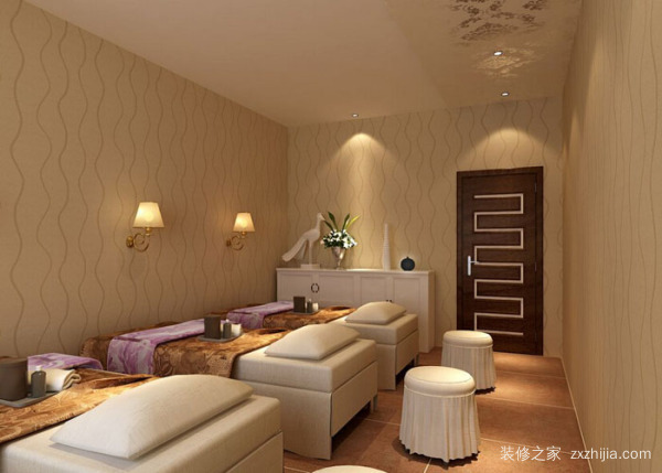 1、美容区墙面可采用软袋、墙纸、墙布、彩色内墙涂料等柔软装饰技术。照明应尽量使用白炽灯,以接近自然光。设置化妆台,墙上设置镜子,方便客户观察美容效果。
