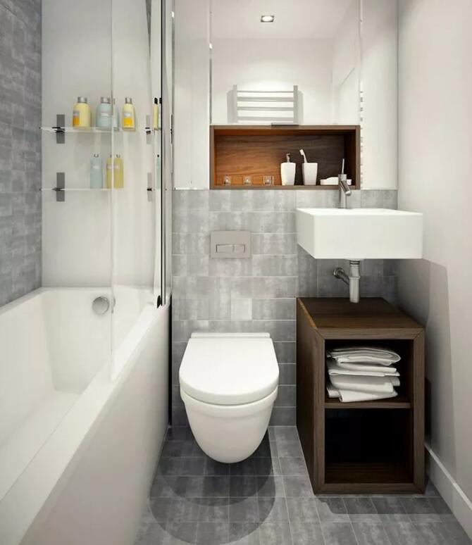 将浴缸和淋浴区合二为一,再加玻璃隔断,这样淋浴时水就不会溅到别处,达到简单的干湿分离。